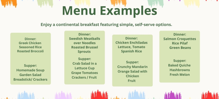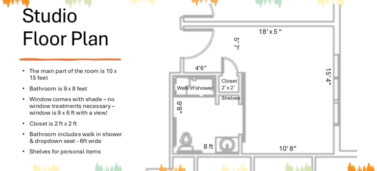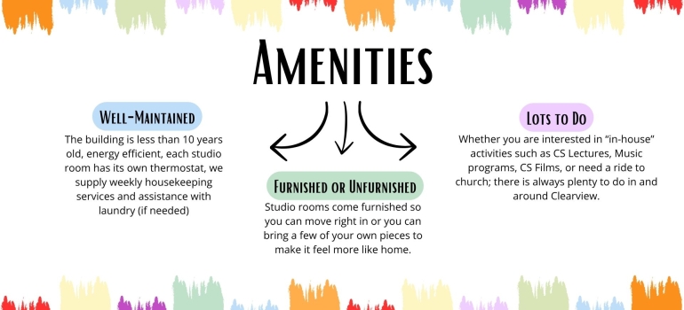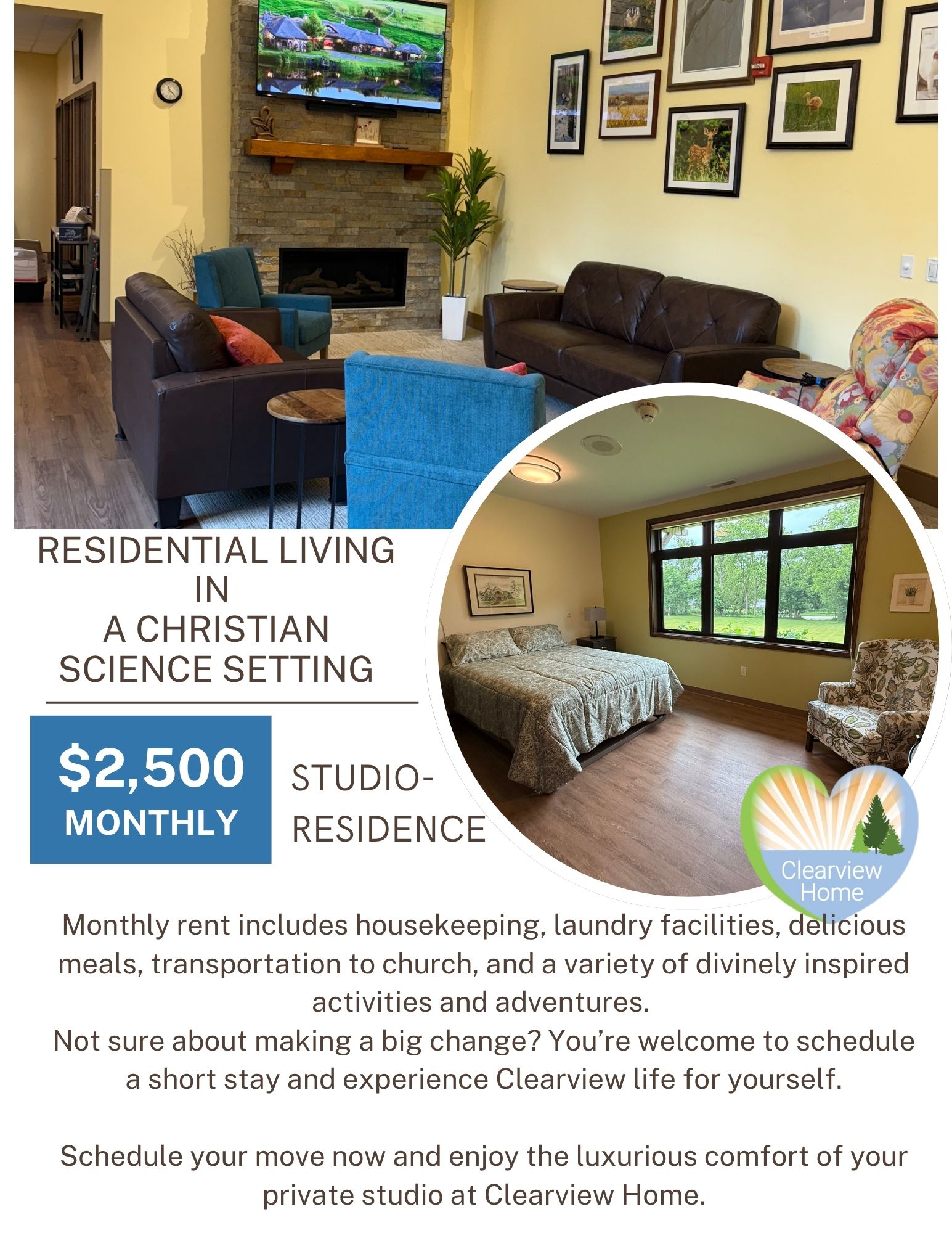 Residential Living includes all three delicious meals a day, laundry, and housekeeping services in a loving homelike environment. Residential studios include a private bath and the ability to bring your own furniture. Also transportation to church and a variety of divinely inspired activities and adventures await you.